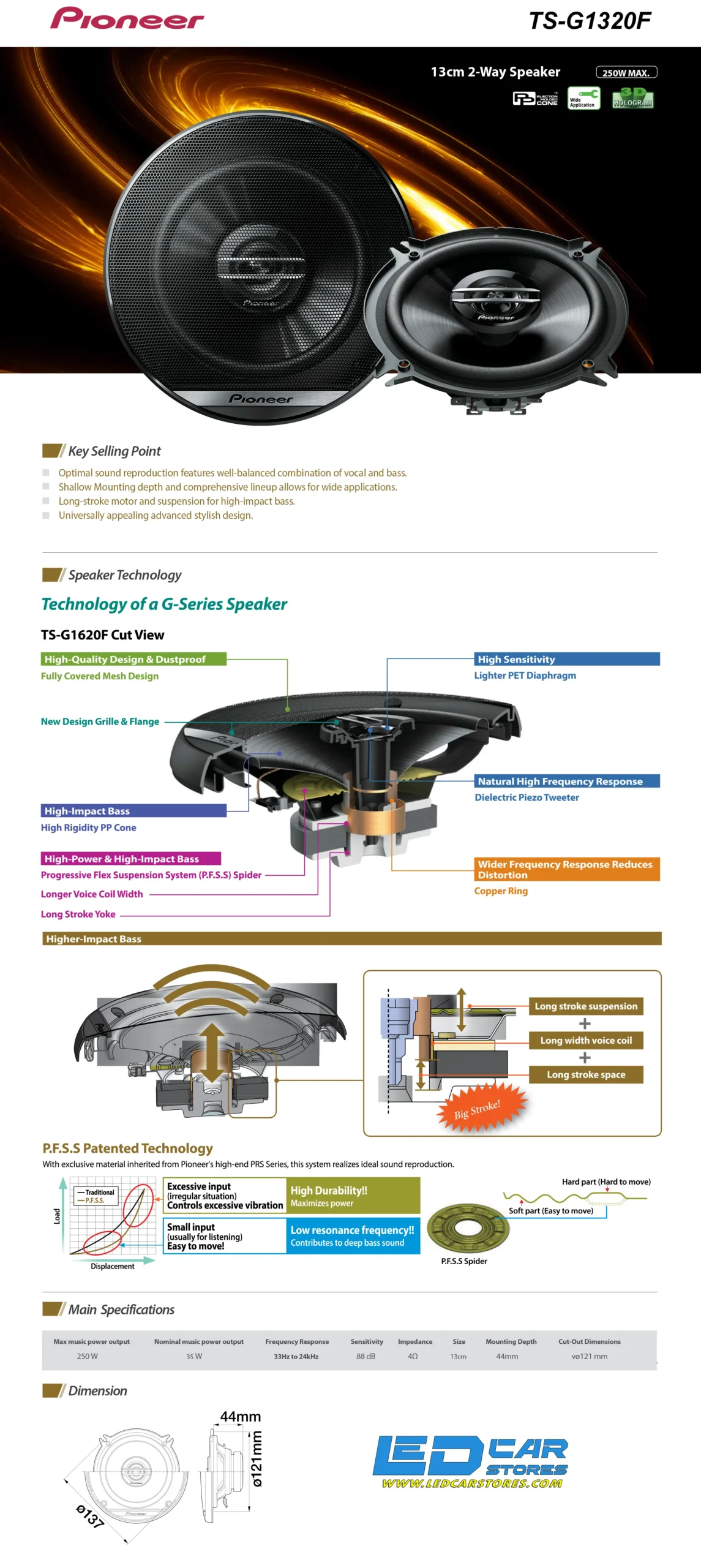 تعتبر سماعات Pioneer TS-G1320F خيارًا ممتازًا لمن يبحث عن ترقية لنظام الصوت في سيارته. بفضل مزيجها من الجودة الصوتية العالية، والجهير القوي، والتصميم الأنيق، وسهولة التركيب، توفر هذه السماعات تجربة استماع ممتعة وغامرة في كل رحلة.