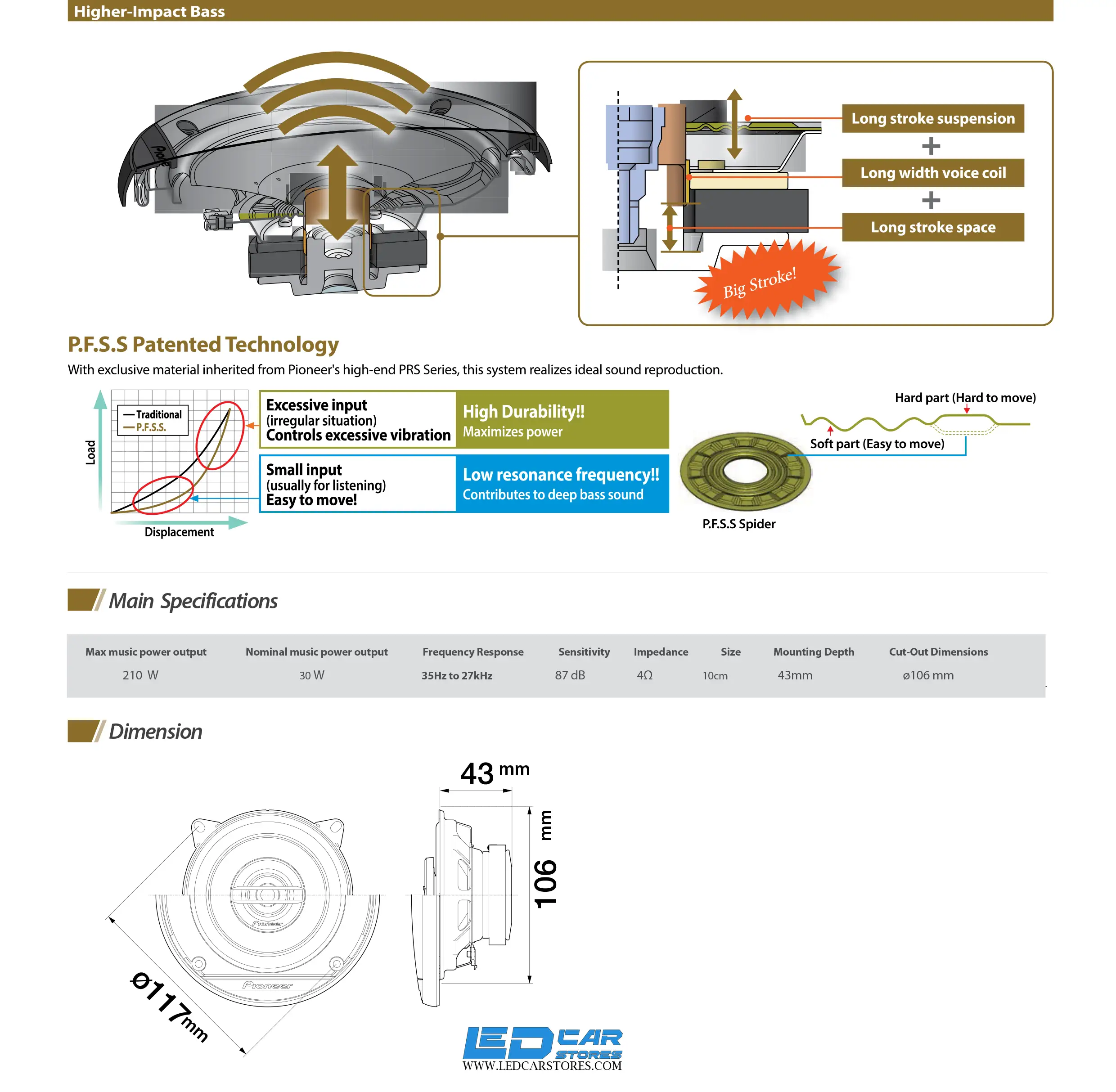 Pioneer 的 GRADE G 系列汽车高音扬声器旨在为您的汽车音响系统提供高品质声音. 该放大器的尺寸相对较小 (10 厘米或 4 英寸) 并且易于安装,适合许多汽车扬声器孔,特别是那些空间有限的.
